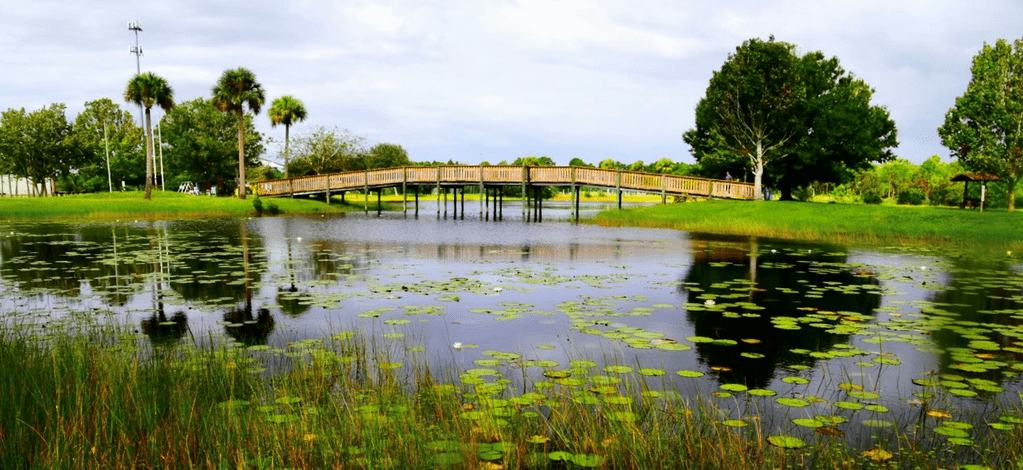 Termite Control Malabar, A wooden footbridge crossing a pond in a park in Malabar, Florida.